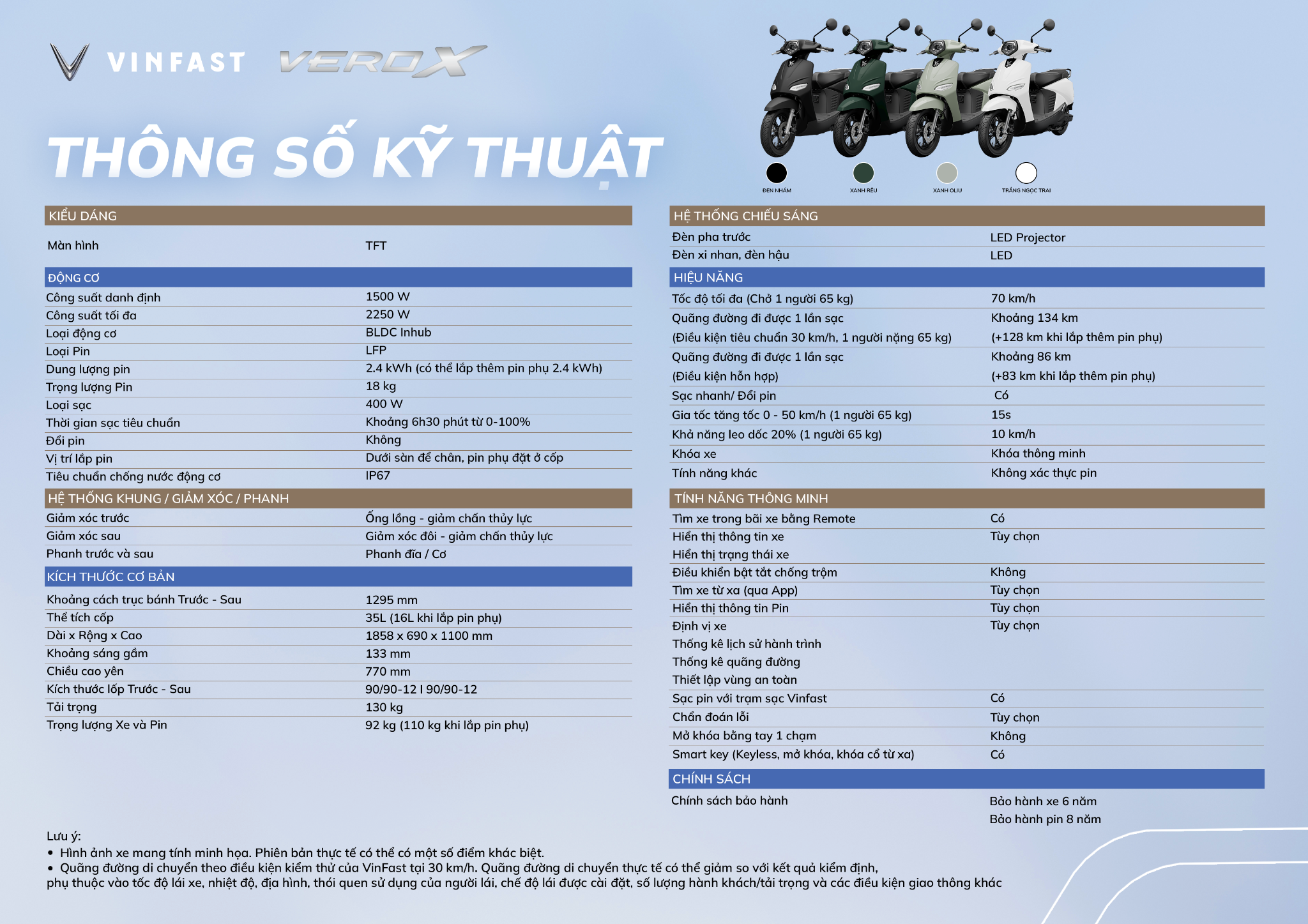 QUÃNG ĐƯỜNG Di Chuyển Đầy Ấn Tượng: Nhờ hệ thống 02 pin LFP tiên tiến (01 pin cố định và 01 pin tháo rời, có thể nâng cấp), Vero X tự tin đạt tới 262 km/lần sạc (theo điều kiện tiêu chuẩn 30 km/h và 01 người lái 65 kg với 02 pin), giúp bạn thoải mái chinh phục những hành trình dài.